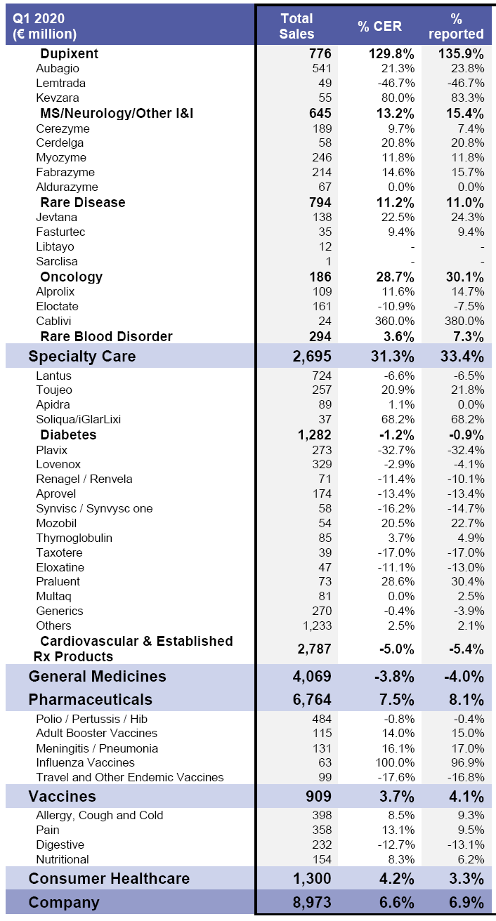 4月23日,赛诺菲(SNY.US)发布2020年Q1财报,净收入达到89.73亿欧元,同比增长6.9%,高于2019年全年4.8%的同比增幅。在公共卫生事件全球蔓延对药企业务经营普遍带来严重不利影响情况下,赛诺菲交出了一个漂亮的一季度业绩答卷,这主要是得益于免疫领域明星药物Dupixent(dupilumab)的强劲表现,销售收入7.76亿欧元,同比增长130%,丝毫未受公共卫生事件的影响。 从具体业务板块来看,Dupixent、Aubagio和一些罕见病药引领下的专科药业务实现收入27亿欧元,同比增长31.3%,抵消了成熟品种和初级护理业务的下滑。