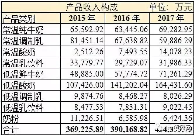 到了2018年9月,新希望乳业在A股首次IPO即获通过,成为新希望家族继新希望(000876.SZ)、宝硕股份(600155.SH)之后的第3家上市公司。上市的背后,是该公司谋求全国市场的野心:新希望设立了奶牛养殖业务分部和乳制品生产业务分部。其中主要收入来自于乳产品生产业务分部,新希望乳业的产品主要包括低温奶制品、常温奶制品、奶粉3大类,9大系列,从各年销售收入及其构成来看: