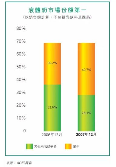 在2007年,蒙牛的液体奶市场占有率已经达到40.7%,远超对手: