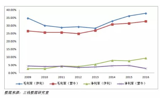 再看伊利与蒙牛的毛利率和净利率会发现:自2009年起,伊利的毛利率一直高于蒙牛,同时其净利率在2013年后也远高于蒙牛。