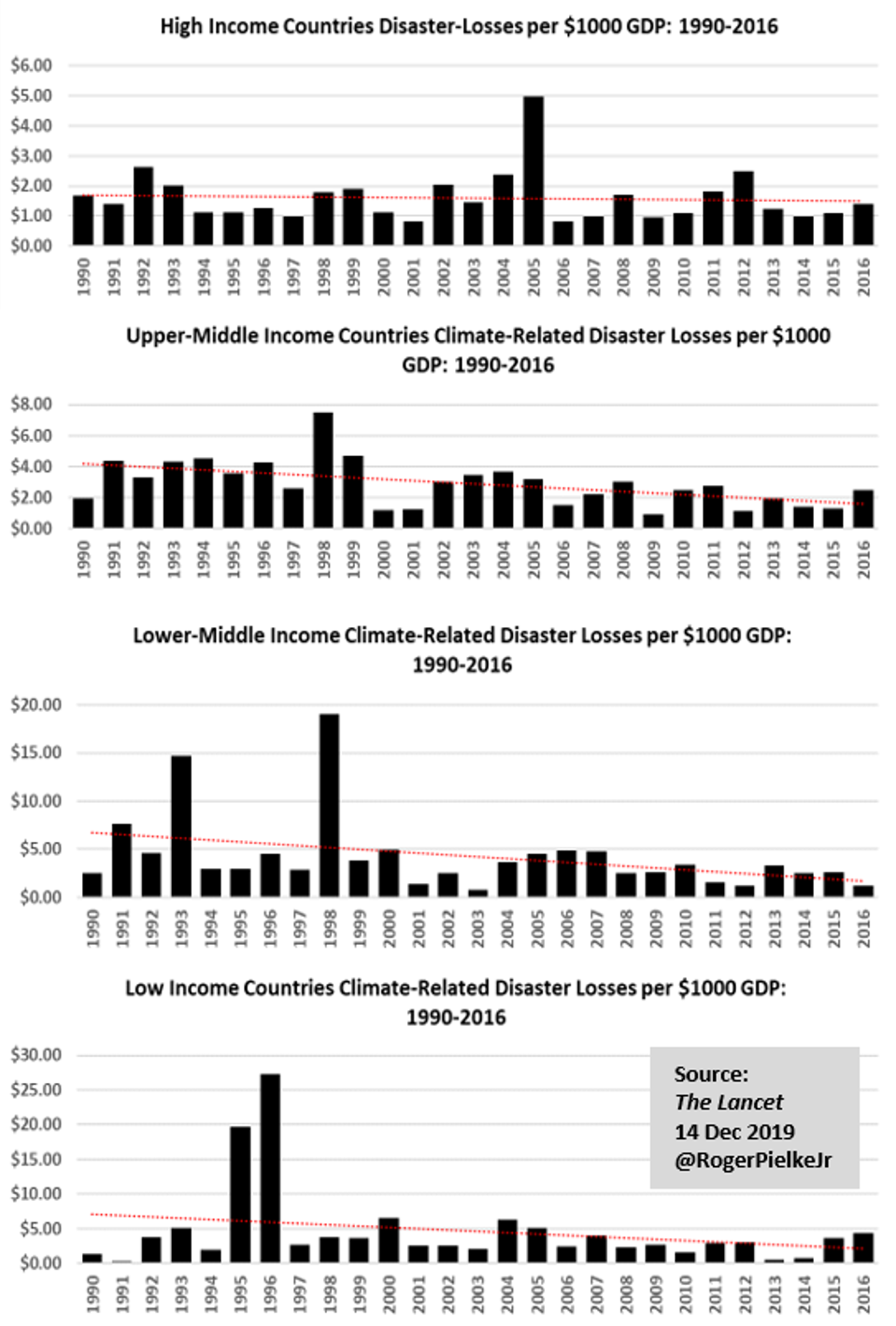 他们发现的结果令人难以置信:所有现象,所有空间规模以及低收入和高收入地区的死亡率(死亡率(占人口总数的百分比)和损害占GDP的比重都下降了(值得注意的例外是:“在高/中高收入国家中,人类对热浪的脆弱性似乎更高”)。这些下降是21世纪上半叶出现的最重要的新兴趋势之一。